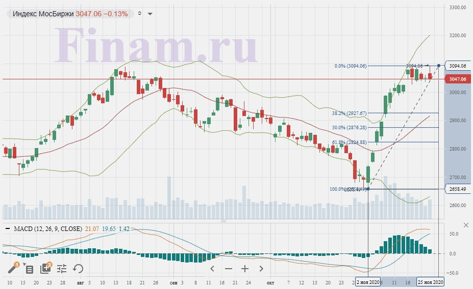 На графике отчетливо видно, что фаза роста пока прекратилась и индекс МосБиржи консолидировался в боковом движении. Падение предыдущей недели приостановилось за счет хорошего открытия торгов сегодняшнего дня. Однако, пока рано говорить, что есть основания для продолжения роста. Слишком много факторов неопределенности присутствуют на фондовых рынках.