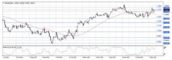 В свою очередь евро получил поддержку и поднялся до пятидневного максимума по отношению к доллару США на фоне роста доходности государственных облигаций еврозоны во вторник. Доллар же не нашел поддержки от данных во вторник, которые показали, что дефицит торгового баланса США по товарам умеренно увеличился в феврале до $-91,63 млрд по сравнению с $- 91,09 млрд месяцем ранее и консенсус-прогнозом от аналитиков в $-91,00 млрд, на фоне снижения экспорта, что потенциально может привести к «торможению» экономического роста в первом квартале 2023.