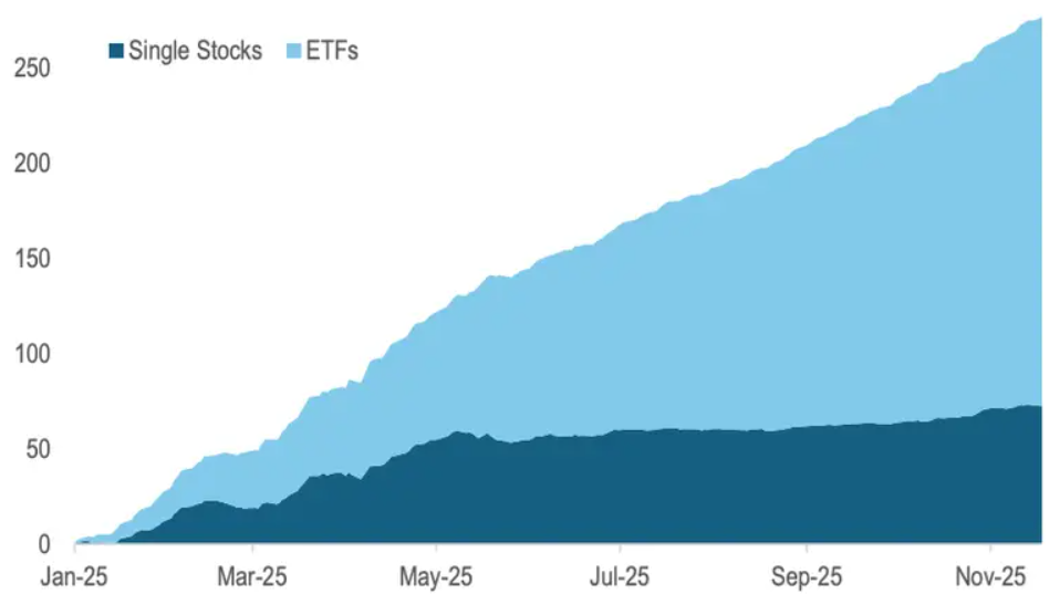 Биржевые фонды (ETF) составили 75% от общего притока средств розничных трейдеров в 2025 году. График показывает, что после того, как волатильность в период с февраля по апрель ослабла, покупки отдельных акций замедлились в пользу ETF и опционов. Это контрастирует с эпохой мемных акций, которая характеризовалась гораздо большей долей покупок отдельных наименований.