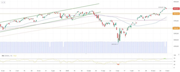 После обновления исторических максимумов ралли американского индекса приостановилось: S&P 500 перешел к коррекции на фоне сигналов перекупленности по индикатору RSI. Снижение может продолжиться вплоть до 6 030 пунктов — ближайшего значимого уровня поддержки.