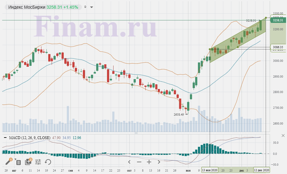 Индекс МосБиржи продолжает оставаться в восходящем канале, не подавая сигналов о возможном скором переходе в фазу консолидации или коррекции. Хотя, следует учитывать, что в случае резкого изменения внешнего фона, инвесторы начнут активно фиксировать прибыль, что приведет к неизбежному развороту.