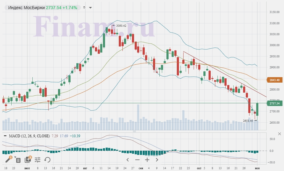 Несмотря на то, что индекс МосБиржи продолжает оставаться в нисходящем тренде, график индекса выглядит уже не так плохо, вернувшись внутрь линий Боллинджера и уверенно направляясь к 50-дневной ЕМА. Индикатор MACD хоть и находится в области «продажи», тоже развернулся в сторону роста и не ровен час через несколько торговых сессий скользящие средние пересекутся «в покупку».