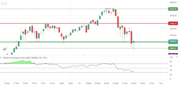 На этой неделе индекс Мосбиржи протестировал уровень поддержки 2900 пунктов и вернулся выше уровня 3000 пунктов. На недельном графике сформировалась разворотная свеча «молот», которой требуется подтверждение в виде бычьего закрытия следующей свечи. Так как на следующей неделе будет заседание ЦБ, то оно может привести к волатильности в обе стороны. Поэтому агрессивное наращивание позиций в данный момент весьма опасно.