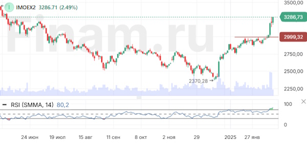 Индекс МосБиржи взял уровень 3000 и проскочил еще через несколько психологических значений, остановившись перед 3300, где может сформироваться новый уровень сопротивления. Индикатор RSI находится выше 80, сигнализируя, что рынок локально перекуплен. Возможна коррекция вплоть до 3000 пунктов, где теперь оформился сильный уровень поддержки.