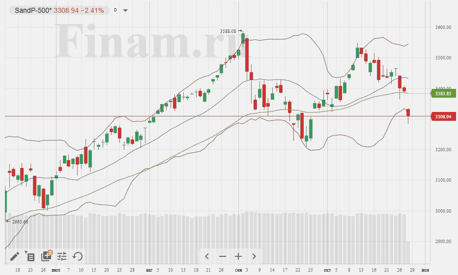 Лишь оттолкнувшись от поддержки на уровне 3284,5 по индексу S&P500 последовала незначительная коррекция после чего рынки консолидировались в боковом движении. Причин для оптимизма действительно немного. Предвыборная гонка с США вышла на финишную прямую и, похоже, это будут самые «грязные» выборы в истории страны. Кандидаты не особо стесняются в выражениях, обвиняя друг друга во всех тяжких. И все это на фоне резко возросшего уровня заболеваемости COVID-19, рисков очередного торможения экономик и не совсем однозначных корпоративных отчетов. По состоянию на 19:18 мск. индекс Dow Jones обвалился уже на 2,47%, индекс широкого рынка S&P 500 падал на 2,45%, индекс высокотехнологичного сектора Nasdaq терял 2,73%.
