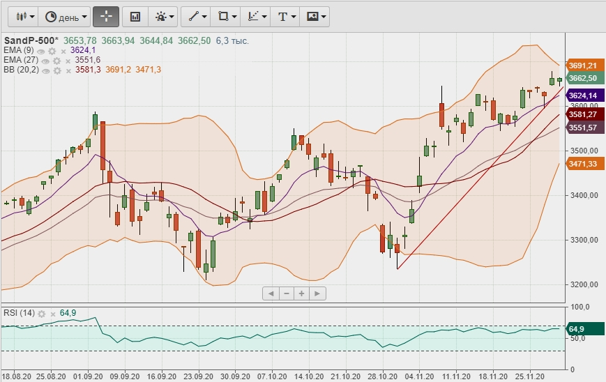 Индекс S&P 500 пока еще продолжает оставаться выше линии восходящего тренда, но уже достаточно близок к пробития её. Линии Боллинджера показывают заметное сближение, что может говорить о возможной консолидации рынка на текущих уровнях. Индекс относительной силы RSI также не выходит за пределы коридора 30%-70%, демонстрируя некоторую усталость рынка и готовность перейти в боковое движение или умеренную коррекцию.