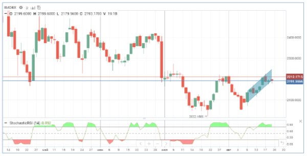 Индекс МосБиржи остановился у нижней границы восходящего канала в районе уровня поддержки в 2190 пунктов. Индекс, вероятно, продолжит консолидироваться в диапазоне 2190 – 2210 пунктов при отсутствии сильных драйверов.
