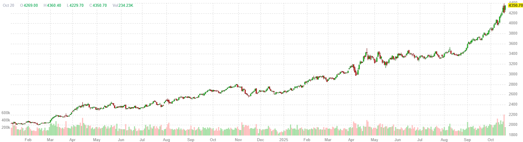 В понедельник декабрьские фьючерсы на золото в США выросли на 3,3%, до $4350,70 за унцию.