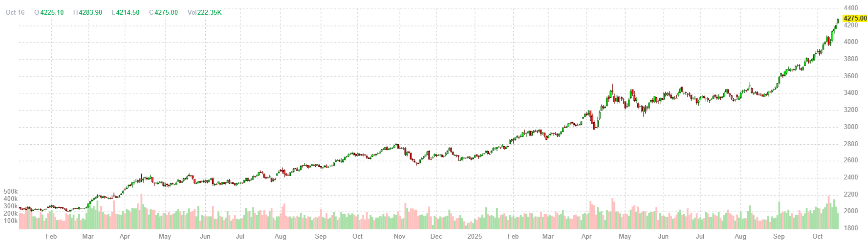 Котировки золота продолжают уверенный рост: декабрьские фьючерсы в США прибавили 1,75%, достигнув отметки $4275 за унцию. Это стало новым историческим максимумом для металла.