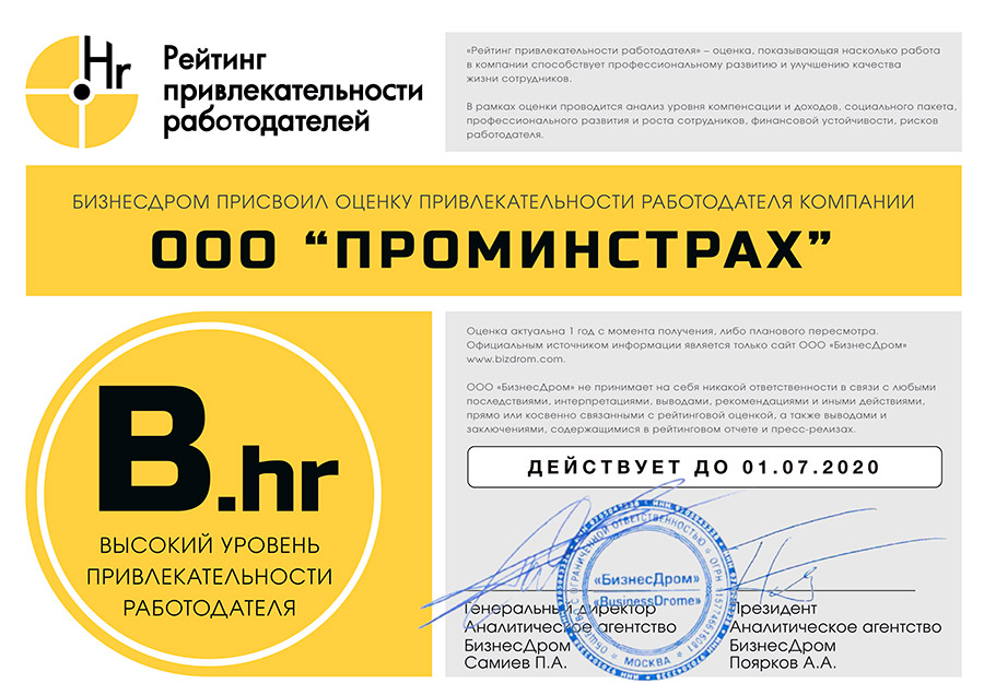 02.07.2019 г. аналитическое агентство БизнесДром присвоило компании ООО «ПРОМИНСТРАХ» Рейтинг привлекательности работодателя на уровне B.hr. Рейтинг присвоен впервые.