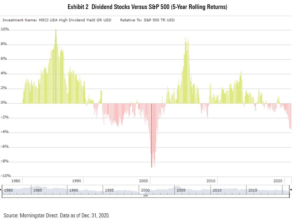 В январской статье Amy C. Arnott в Morningstar приводится очень простой и наглядный анализ эффективности вложений в дивидендные акции в США за период 1976-2020 г. (см. рис. 1) на основании скользящих средних 5-летней доходности дивидендных акций и индекса S&P.