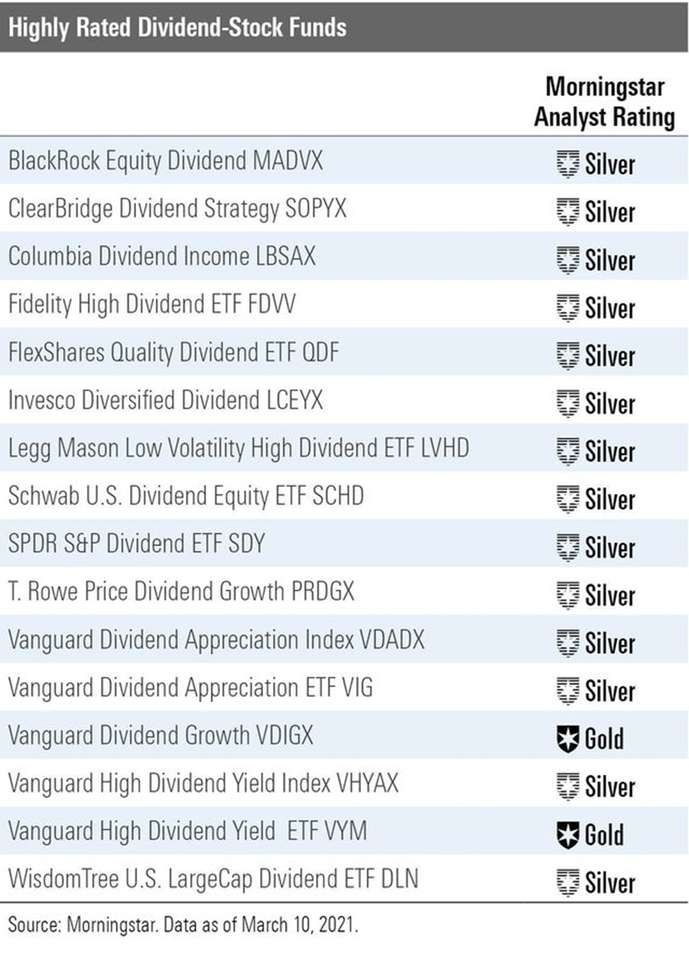 А в табличке приводятся данные о лучших дивидендных фондах в США на сегодняшний день по версии Morningstar.