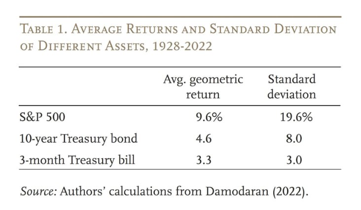 В своем докладе она сравнила финансовое состояние государственного ПФ США с тремя аналогичными государственными фондами, инвестирующими в акции (Canada Pension Plan и двумя американскими программами соответственно для работников железных дорог и бюджетников Railroad Retirement system и Federal Thrift Savings Plan). Ситуация разительно отличается, увы не в пользу ПФ США. Для того, чтобы почувствовать разницу Маннелл приводит статистику среднегодовой доходности вложений в акции S&P500 и 10-летние годовые облигации США на 95-летнем горизонта с 1928 г. по 2023 г. – соответственно 9,6% годовых и 4,6% годовых (см. рисунок выше). Выглядит впечатляющее.