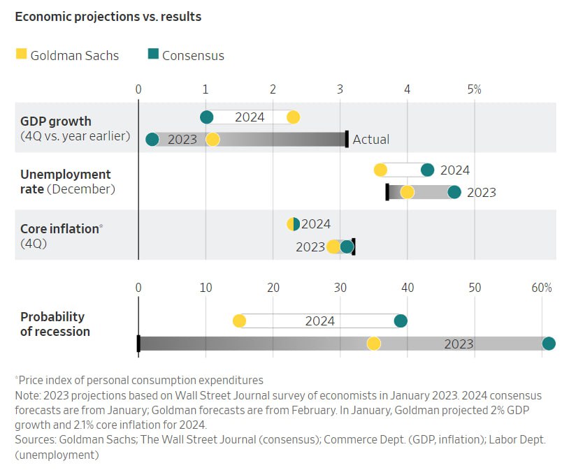 1. Команда экономистов Goldman Sachs во главе с Яном Хациусом с оптимизмом смотрит на экономику в этом году. Они прогнозируют здоровый рост на уровне 2,3%, уровень безработицы останется ниже 4%, а вероятность рецессии составляет всего 15% – все это более оптимистично, чем консенсус прогноз у WSJ. Инфляция, исключая продукты питания и энергоносители, продолжит падать до чуть более 2% к концу года.