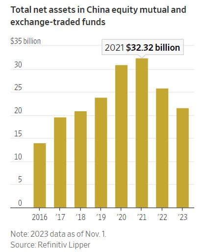 WSJ пишет о том, что китайские акции пока разочаровывают портфельных инвесторов, ожидавших роста рынка после снятия ограничений по Covid-19. Доходность акций низкая, уверенности в будущем росте нет. Согласно данным Refinitiv Lipper, в 2023 г. частные инвесторы вывели $1,6 млрд из взаимных и биржевых фондов, ориентированных на Китай. Суммарные чистые активы этих фондов составляют $21,6 млрд, что на одну треть ниже пикового значения в 2021 г. из-за оттока средств и слабых показателей.