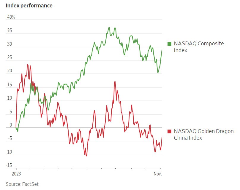 Компании, акции которых котируются на бирже в США и которые ведут значительный бизнес в Китае, столкнулись с трудностями. Индекс Nasdaq Golden Dragon China, который отслеживает 79 компаний, включая Alibaba, резко вырос в начале 2023 года, но сейчас снизился на 4,5% за год. Тем временем индекс Nasdaq Composite в 2023 году вырос на 30%.