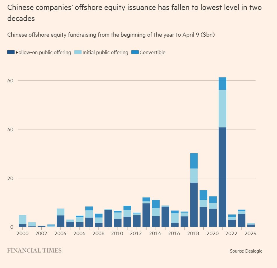 Интересная статья в FT о китайском фондовом рынке, переживающем непростой период снижения доверия внешних и внутренних инвесторов. Издание пишет, что активность инвесторов на рынках акций материкового Китая и за его пределами упала до минимума за несколько десятилетий, показывая, как потеря темпов роста во второй по величине экономике мира повлияла на доверие инвесторов. По данным Dealogic, в этом году китайские компании на материке привлекли на IPO и иных размещений акций всего $6,4 млрд. – это самый низкий уровень за всю историю (см. график выше). Привлечение средств на оффшорных рынках, включая Гонконг, составило 1,6 млрд долл., что является самым низким показателем с 2003 г. Объем слияний и поглощений Китая в размере 2,5 млрд долл. является самым низким с 2005 года.