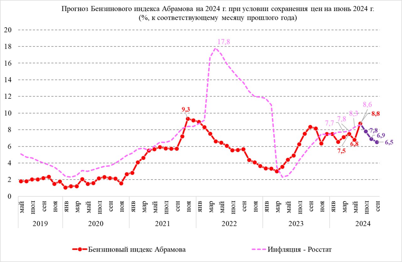 Что говорит мой бензиновый индекс? В июне (г/г) он составил 8,75%, то есть практически очень близкую величину к официальной инфляции (8,59%). То есть в июне эти показатели опять сошлись, так происходит регулярно. Это значит, что закономерность работает – официальная и таргетируемая через топливный демпфер уровни инфляции стремятся соответствовать друг другу. В первой половине 2024 г. бензиновый индекс (красная кривая на графике) периодически оказывается немного ниже инфляции, видимо, отражая стремление правительства сдержать рост инфляции.