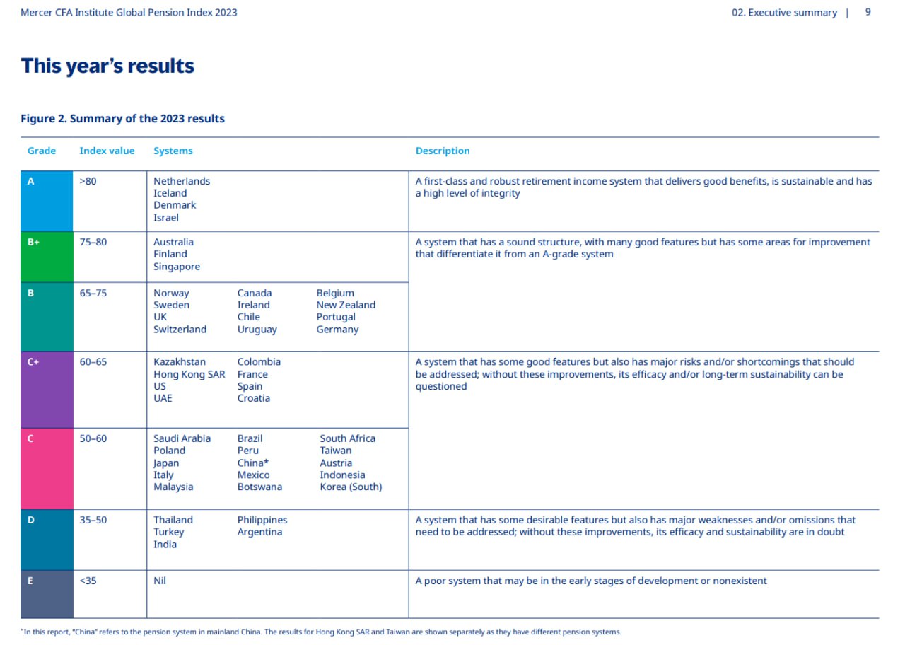 Важное событие для тех, кто хочет узнать, каким странам удалось построить наиболее надежные и эффективные пенсионные системы. В середине октября 2023 г. был опубликован Mercer CFA Institute Global Pension Index 2023. В этом международном рейтинге приняли участие уже 47 стран мира, включая Казахстан, Индию, Китай, Бразилию, ЮАР, Турцию, Польшу. Самые успешные пенсионные системы в мире согласно рейтингу в Нидерландах, Исландии, Дании и Израиле. Относительно высокое место занял Казахстан в одной группе с США, Гонконгом, Францией. Это значительно лучше, чем достижения в Южной Корее, Китае, Бразилии, Японии, Мексике. Польша и Турция, на чьи пенсионные системы, как мне кажется, ориентировались и разработчики ИПК, ГПП и теперь ПДС занимают относительно низкие места в рейтинге.