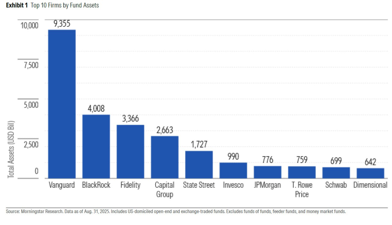 Американский рынок коллективных инвестиций по-прежнему характеризуется высокой концентрацией крупнейших игроков. Vanguard, BlackRock и Fidelity управляют примерно 50% активов всех фондов (взаимных фондов и ETFs) под управлением в США.