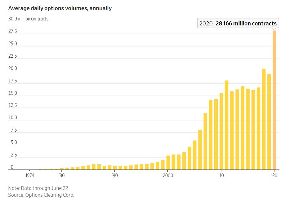 Люди, желающие получить прибыль от взрывных движений на фондовом рынке, накапливают опционы, стимулируемые низкими торговыми сборами и ставками на огромные прибыли. Частные инвесторы – надолго застрявшие дома во время пандемии – находят, что торговать опционами дешевле и проще, чем когда-либо прежде. Популярные приложения, такие как приложение от Robinhood Markets Inc., предлагают самые низкие комиссии за опционные сделки.