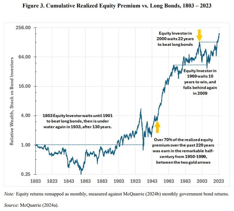 Маккуорри, известный тем, что составил ряды доходности американских акций и облигаций с 1793 г., переплюнув других экономистов (Дж. Сигеля, Р. Шиллера и др.), давно пытается оспорить правомерность понятия «премия за риск по акциям» (см. два рисунка выше). По его расчетам, инвестору, купившему американские акции в 1804 году, пришлось бы ждать 97 лет, прежде чем их доходность превзойдёт доходность облигаций. К 1933 году они снова отстали бы. Статистический тест связи между дисперсией и доходностью за весь период базы данных не смог даже обнаружить «умеренную или непостоянную» премию за риск. Кумулятивная премия за риск акций (до 2023 года), тем не менее, была большой. Но 70% её пришлось на исключительный период между 1950 и 1999 годами. В остальное время относительная доходность акций была средней или низкой.