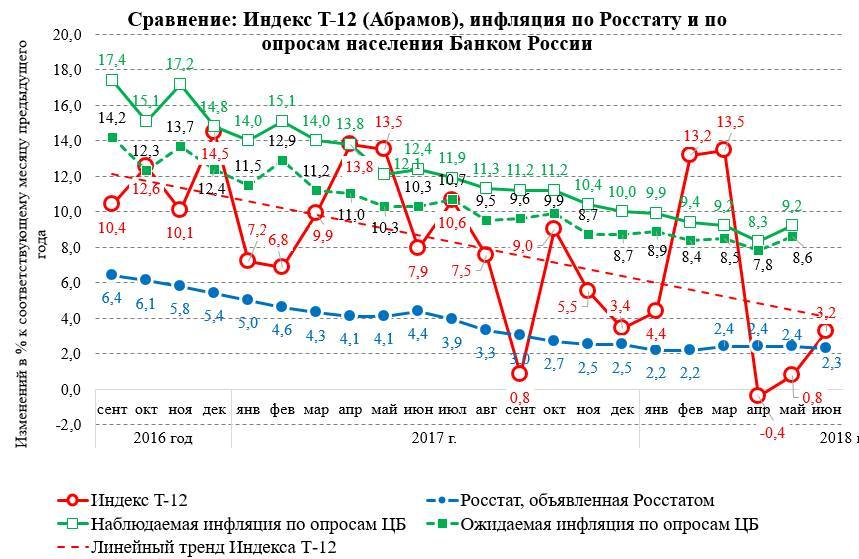 Наш индекс продуктовой инфляции в Москве – Индекс Т-12 - в июне вырос до 3,2% по отношению к июню 2017 г. Показатель приблизился к своему равновесному значению по линии линейного тренда. Напомню, Индекс Т-12 рассчитывается нами ежемесячно по 12 типовым товарным позициям в трех московских сетях. Официальный уровень роста потребительских цен Росстата в июне составил 2,3% годовых. На нашем графике, скорее УДИВЛЯЕТ заметная ЗАДЕРЖКА БАНКА РОССИИ В ПУБЛИКАЦИИ данных об ожидаемой инфляции. Банк России уже на несколько дней запаздывает с публикацией этих данных. В прошлом месяце (мае) был зафиксирован заметный рост ожиданий населения по поводу инфляции. Похоже, Банк России столкнулся с неудобной статистикой.
