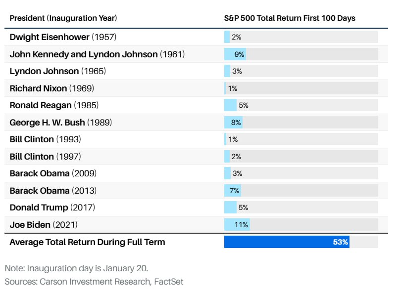 С 1949 г. в течение семи раз, когда рынки падали в первые 100 дней президента, средняя общая доходность в течение 4-летнего срока составляла 20,6%. Когда рынки росли в первые 100 дней, общая доходность в среднем составляла 53%. интересно, но рынок хорош тем, что в любом случае акции растут.