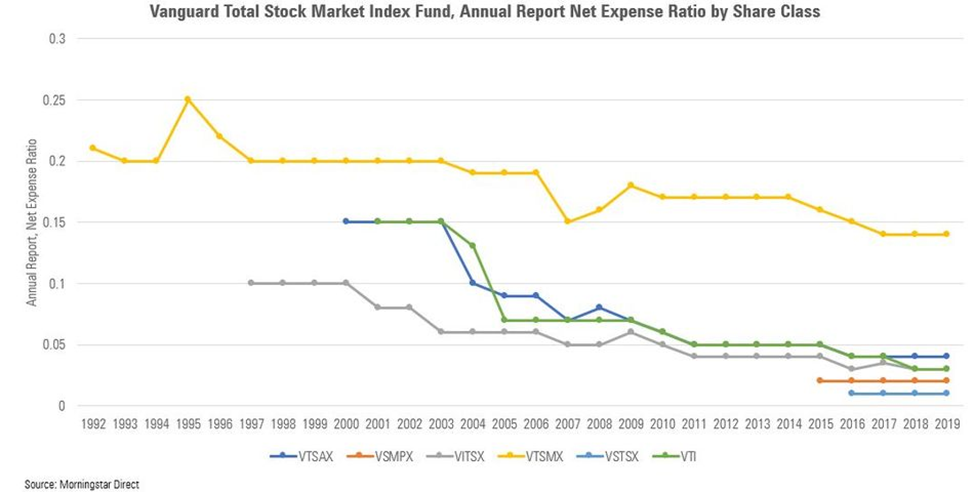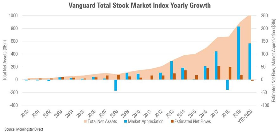 Что же это, пожалуй, значимое событие. В мире появился первый взаимных фонд со стоимостью активов 1 трлн долл. - Vanguard Total Stock Market Index (VITSX). Morningstar пишет, по состоянию на 30 ноября активы фонда Vanguard составляли 1 035 112 935 440 долларов. Созданный в 1992 году фонд, включает как традиционные классы акций взаимных фондов, так и класс акций ETFs. То есть в него можно инвестировать, покупая акции взаимного фонда или акции ETFs по выбору инвестора. Такая у Vanguard инновация.