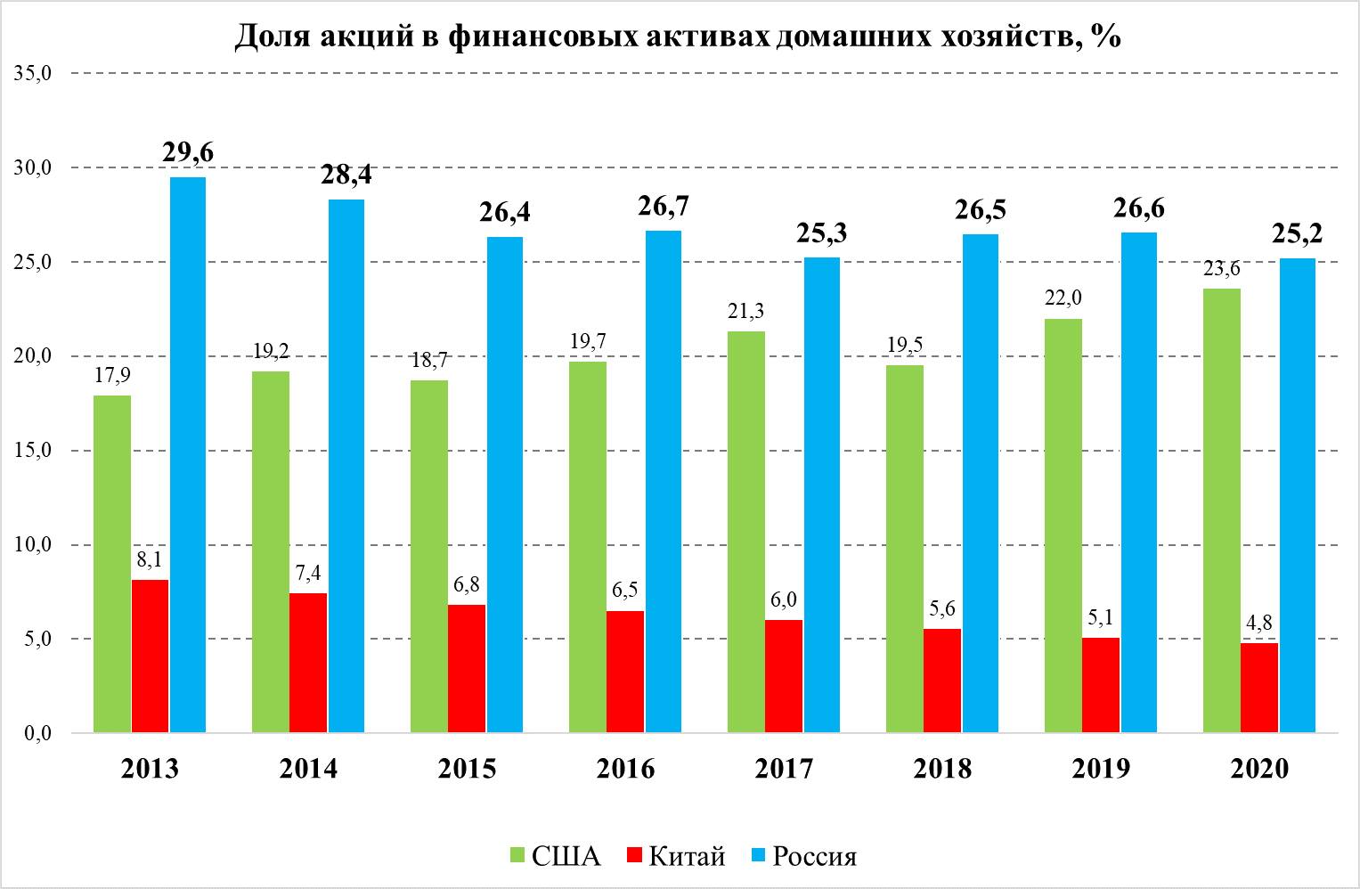 По данным статистики финансовых счетов центральных банков попытался сравнить долю прямых вложений в АКЦИИ в общей стоимости финансовых активов ДОМАШНИХ ХОЗЯЙСТВ в США, Китае и России (данные по России по состоянию на октябрь 2020 г.). Результат удивил. Прямые инвестиции в акции домашних хозяйств в России оказались ВЫШЕ, чем у населения в США и на порядок выше, чем в Китае. Несмотря на «массовый приход частных инвесторов» на биржу доля активов домашних хозяйств в акции у населения России в целом не растет, а снижается. Впрочем, как и в Китае. По моему мнению, данные о финансовых активах домашних хозяйств в России в статистике финансовых счетов сильно искажены объединением финансов простых людей и олигархов. Получается, у каждой группы свои проблемы. У олигархов слишком много акций, а у населения слишком мало иных сбережений.