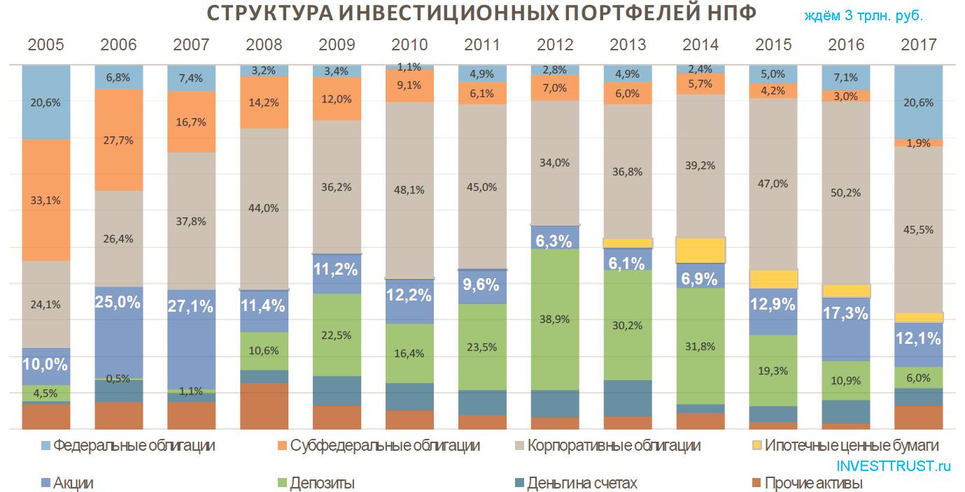 Знаете ли вы, что сейчас НПФы инвестируют в акции лишь 12% пенсионных накоплений? Максимальные вложения были перед кризисом 2008г. и составляли 27%. Как считаете, увеличится ли доля акций в портфелях фондов в ближайшие годы? Кстати, в этом году объём средств в управлении превысит 3 трлн. руб. и будет практически в 2 раза больше, чем в ДУ у УК "Внешэкономбанка" (1,67 трлн. руб.). 15% от ПН НПФов - это 450 млрд. руб.