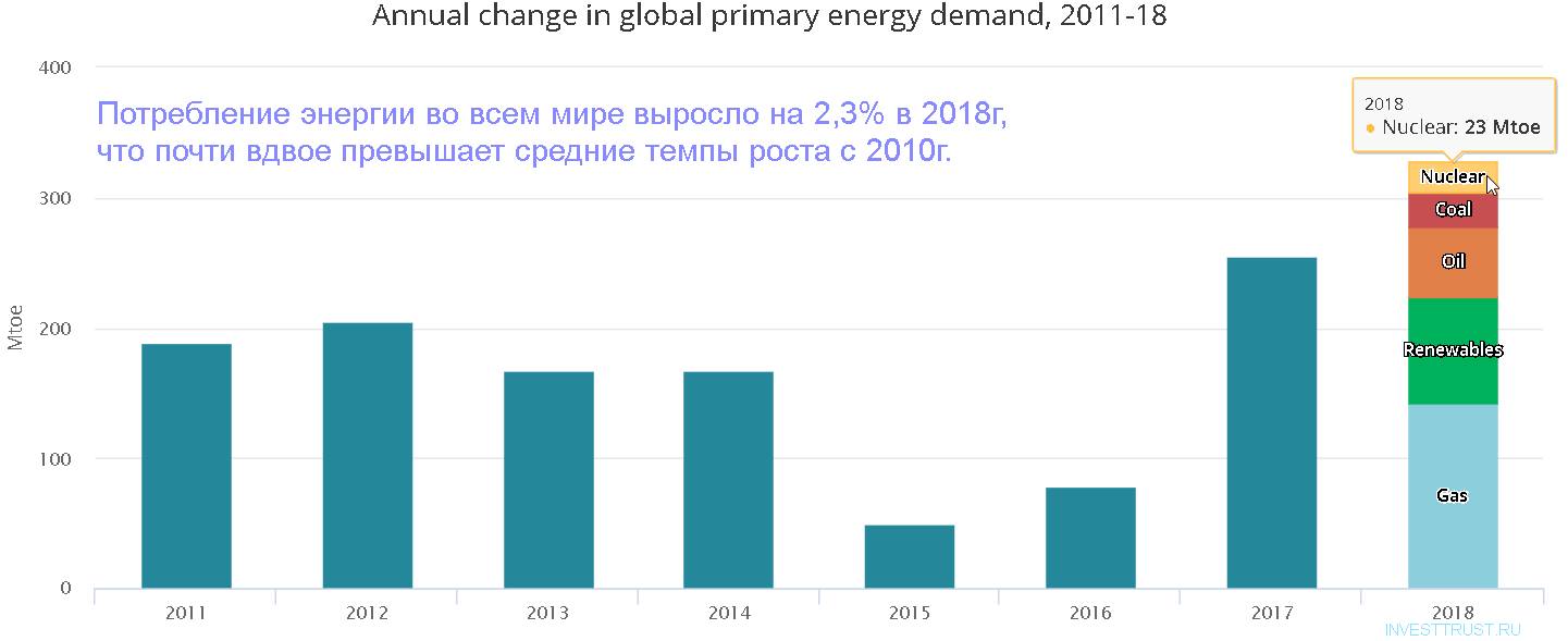 На прошлой неделе вышел отчёт о мировом потреблении энергии. Спешу с вами поделиться, друзья мои. В 2018г. были максимальные темпы роста использования энергии с 2010г., после мирового кризиса. Быстрее всего выросло потребление газа, на 4,3% по итогам года. Привожу динамику по годам. Возобновляемые источники энергии – это гидро, ветра и солнца по 30% и др.