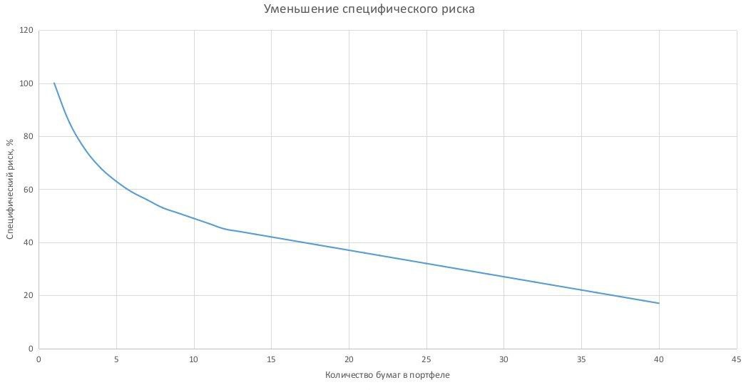 Из теории мы знаем, что диверсификация позволяет снизить специфический риск отдельных активов, секторов экономики или регионов, поскольку негативные события одной бумаги компенсируются положительными результатами других. Таким образом она оказывает значительное влияние на снижение волатильности. Однако, эффект уменьшается по мере увеличения числа активов. Опять же, из теории специфический риск снижается по закону близкому к экспоненциальному (смотри график). Так, например, рост количества активов в портфеле с 5 до 10, уменьшает специфические риски примерно на 24%, а вот уже с 25 до 30 - только на 7%.