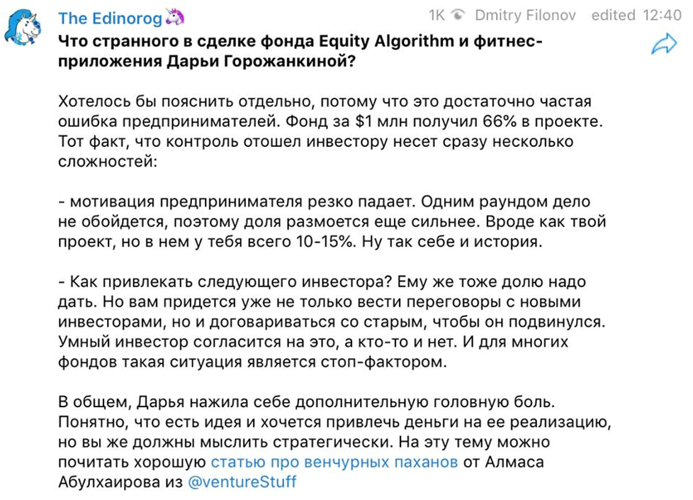 Газеты пишут, что венчурный фонд Equity Algorithm бывшего заместителя гендиректора ВГТРК Дмитрия Медникова инвестирует $1 млн в создание приложения для iOS Champions Fitness Center девушки Дарьи. А Единорог пишет, что что, мол, Дарья сделала ошибку, ведь такую большую долю отдала инвестору...