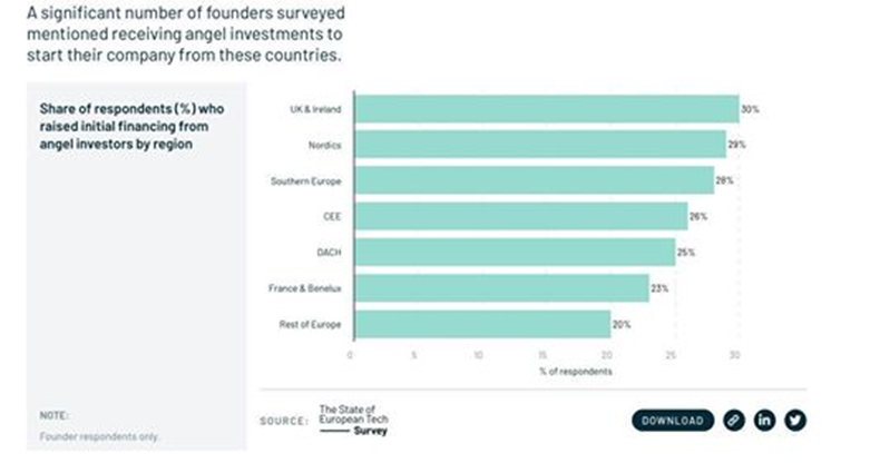 Нашел любопытную картинку о доли участия бизнес-ангелов в финансировании стартапов в Европе.