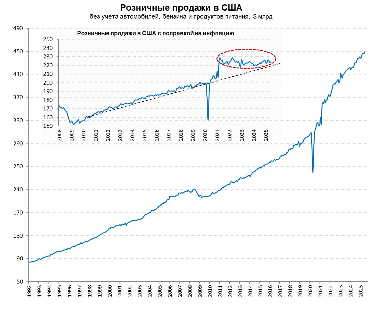 ✔️Розница: потребитель США в начале лета успокоился и снова потребляет. Розничные продажи за июнь выросли на 0.6% м/м, годовая динамика ускорилась до 3.7% г/г и немного обгоняет инфляцию. Без учета волатильных бензина, продуктов и автомобилей продажи выросли на 0.6% м/м и 4.5% г/г. Хотя, если смотреть в целом – спрос в реальном выражении сильно не меняется после бурного постковидного взлета.