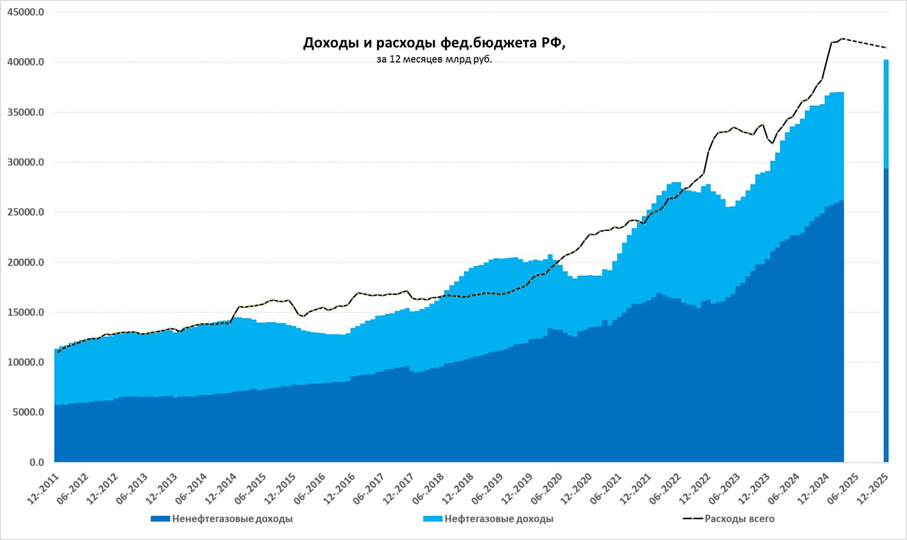 В сумме за 12 месяцев расходы бюджета составили ₽42.4 трлн и идут выше планового уровня ₽41.5 трлн, доходы бюджета составили ₽37 трлн, накопленный дефицит за 12 месяцев превышает ₽5.35 трлн.