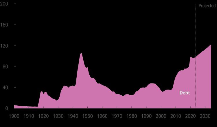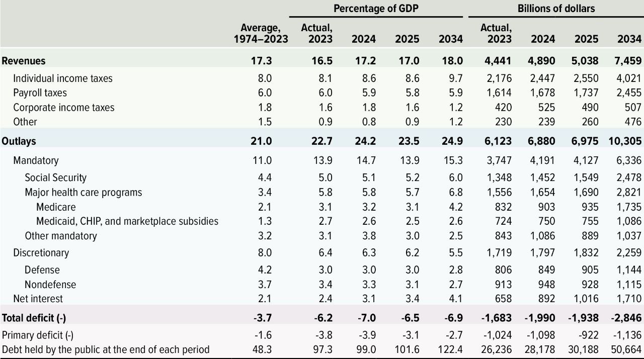 Иллюзии относительно того, что дефицит сократится до 3.7% ВВП к 2034 году окончательно исчезли и дефицит через 10 лет прогнозируется на уровне 6.9% ВВП ($2.85 трлн), долг же вырастет с 99% ВВП в 2024 году до 122% ВВП в 2034 году.