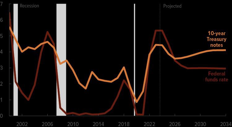 Чистые процентные расходы вырастут до $1.7 трлн (4.1% ВВП) через 10 лет, несмотря на снижение ставок ФРС до 3% и стабилизации доходности десятилетних облигаций на уровне 4% годовых.
