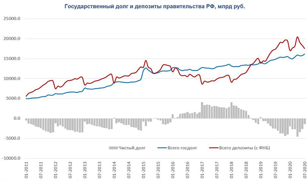 Если посмотреть на совокупный долг государства (вместе с местными долгами, но за вычетом межбюджетных долгов), то он составлял на средину 2020 года 16.1 трлн руб., за первое полугодие он вырос на 1.1 трлн руб. (около 1% ВВП). Депозиты органов госуправления (с учетом ФНБ) в ЦБ и банках составили 17.6 трлн руб., на середину года чистый долг госорганов оставался отрицательным.