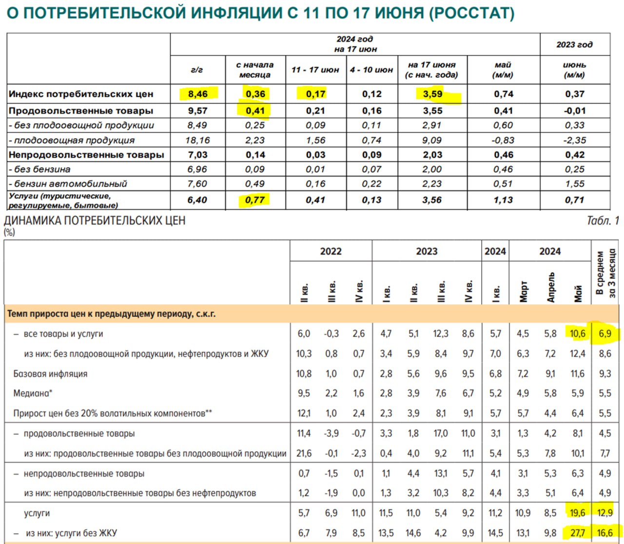 Недельная инфляция снова подросла с 0.12% до 0.17%, в итоге инфляция с начала месяца уже добралась до 0.36%, а инфляция начала года 3.59% (здесь тоже большую роль играют услуги транспорта). Учитывая повышение тарифов, в июле как раз исполним середину цели Банка России (4.3-4.8%).