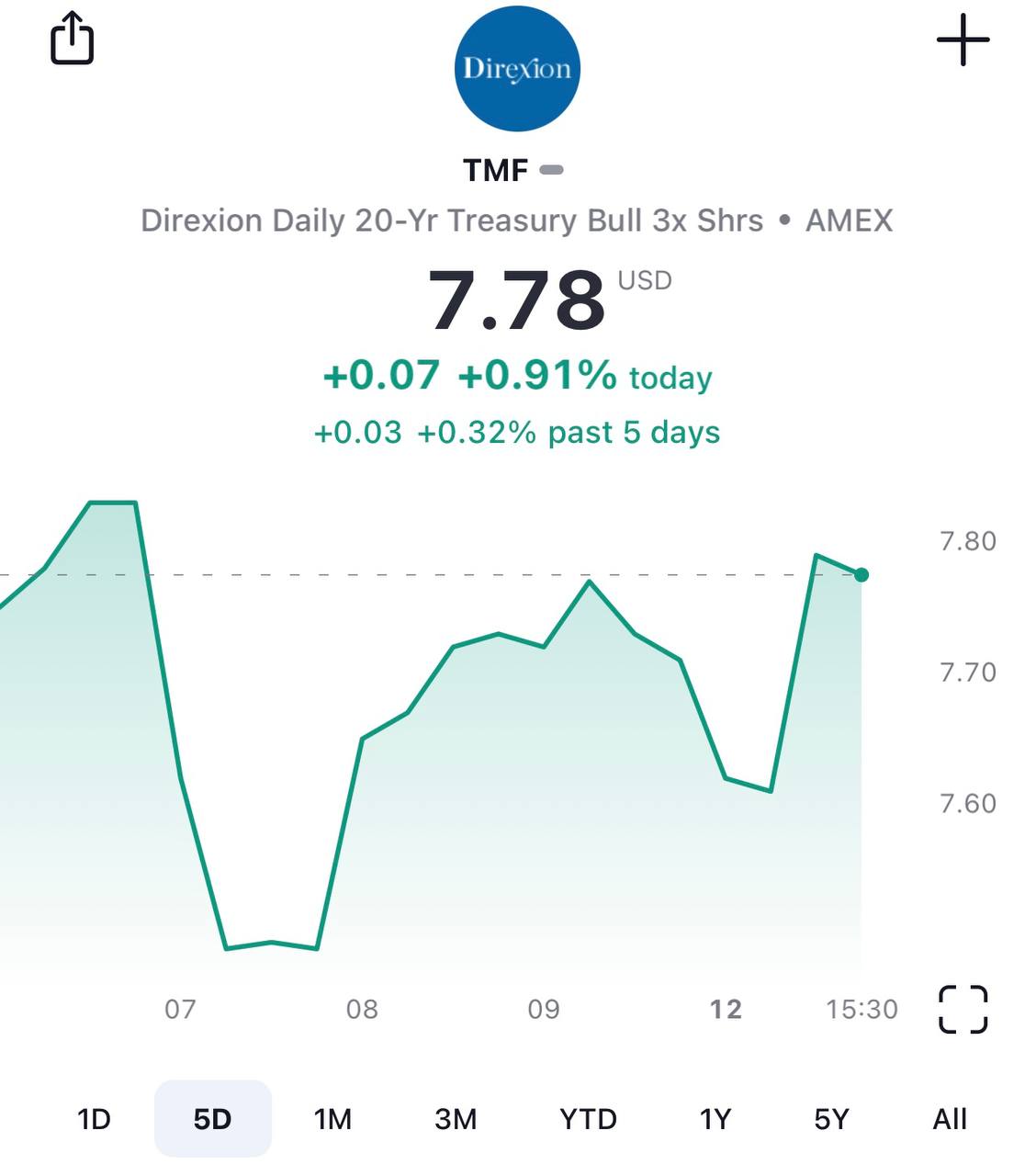 А вот, как уже сказал ранее, Direxion Daily 20+ Year Treasury Bull 3X Shares ETF (TMF) держу.