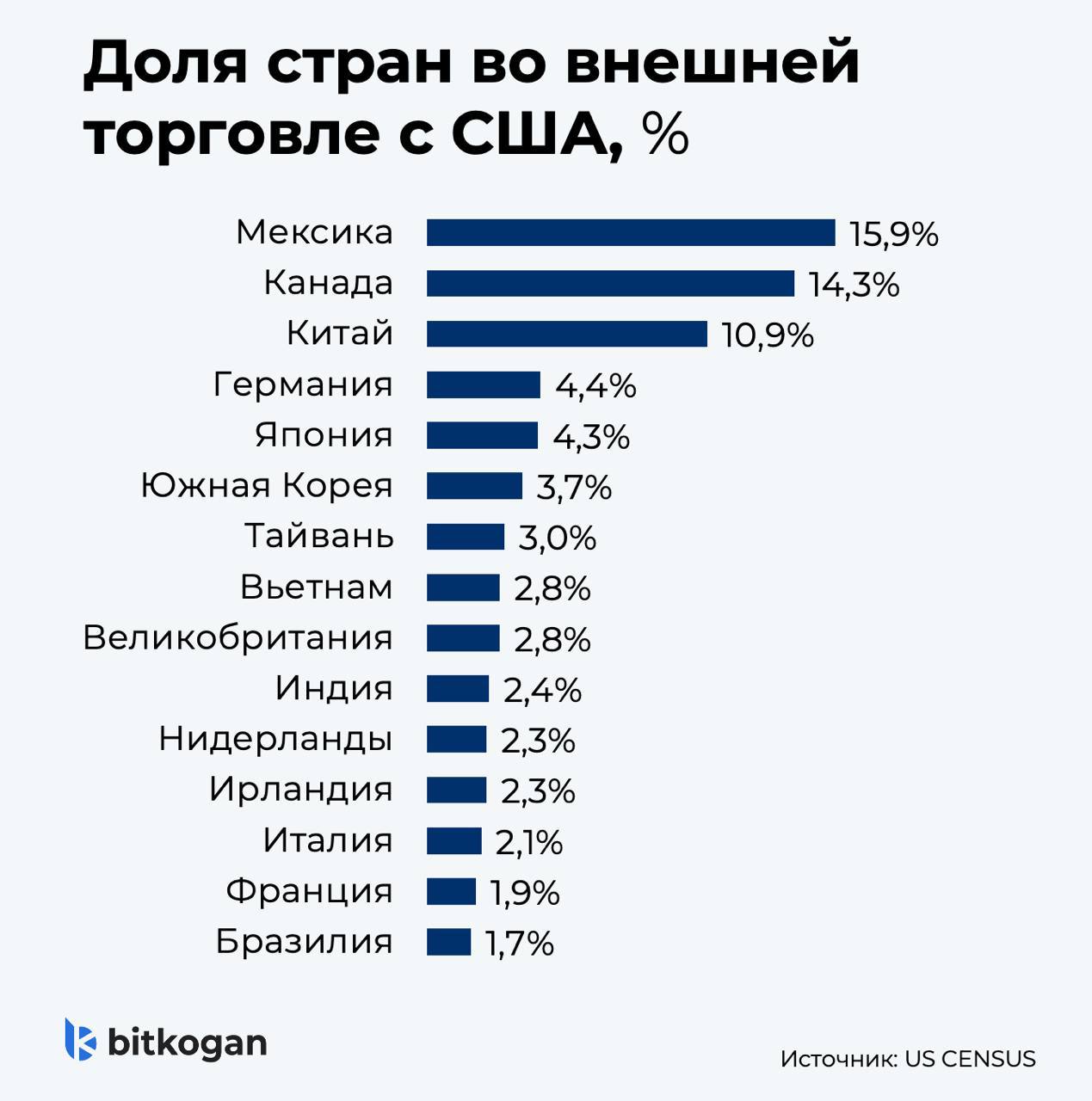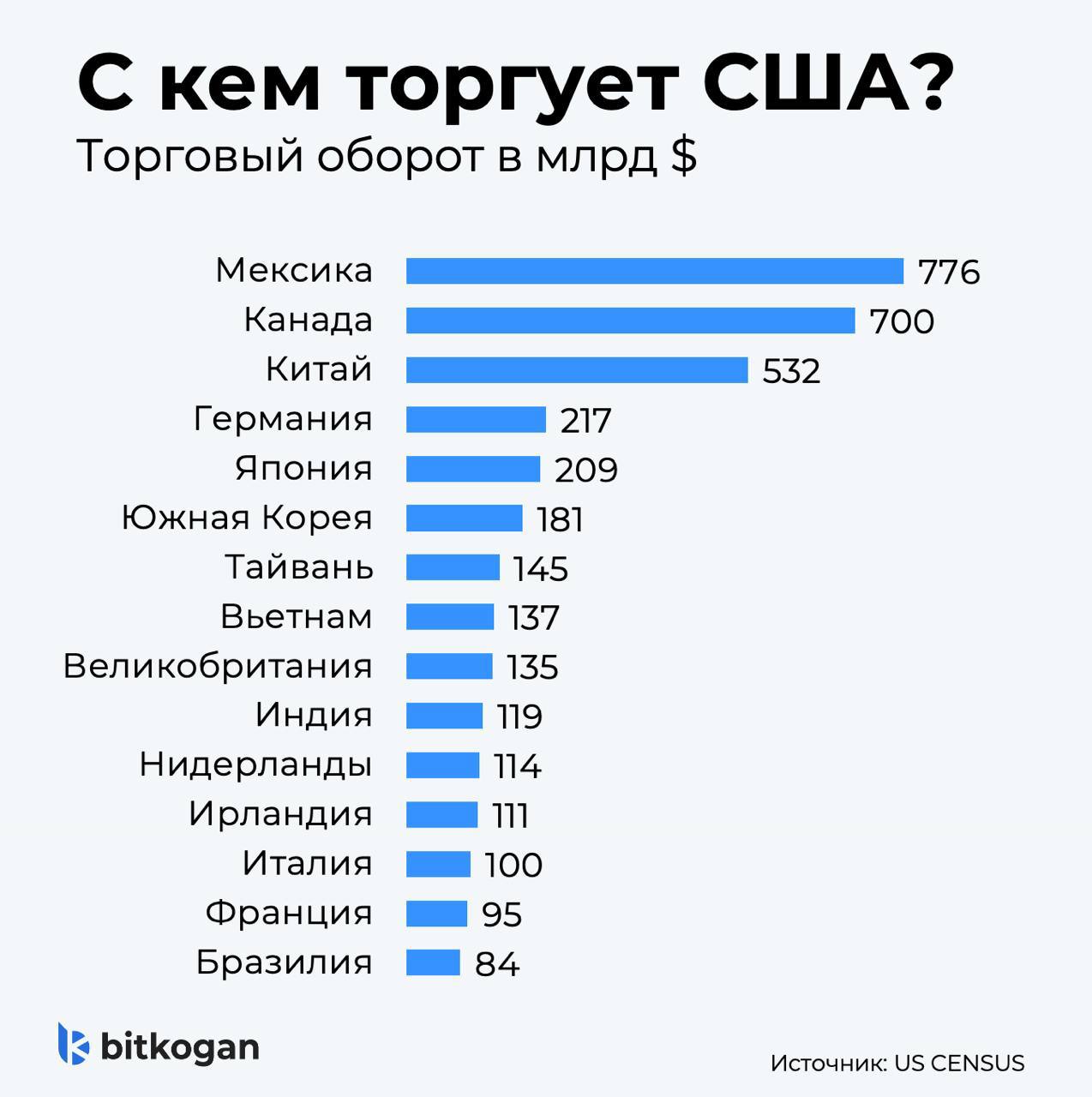 Прежде всего, главные экономические партнеры: Канада, Мексика и Китай, на которые совокупно приходится более 40% торгового оборота Штатов.