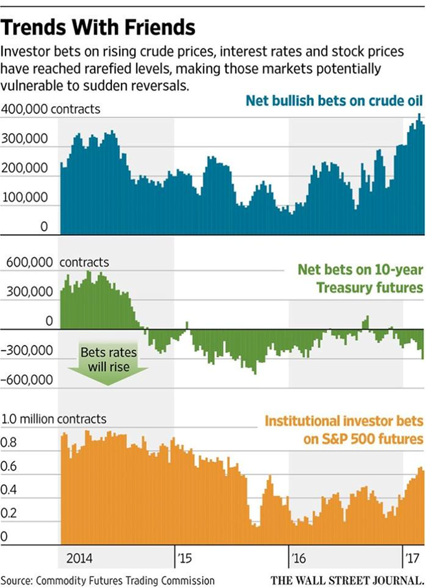 Александр Абрамов: «WSJ напоминает, что на этой неделе могут произойти важные события по ставке ФРС и Brexit. Они приводят интересный график. На фьючерсном рынке максимума достигли ставки на рост нефти, индекса SP500 и ставки. Это может сигнализировать о скором развороте»: