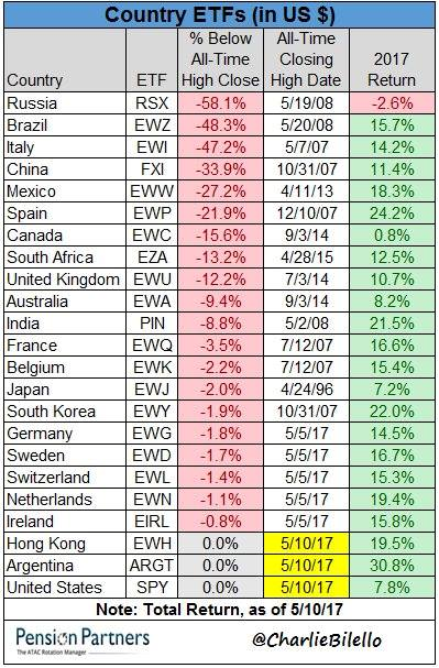 Олег Харитонов: «Есть такая тема как ETF по странам мира. Доходность с начала года. Хорошая картинка не мог пройти мимо ))). У нес что-то не получается с ростом видимо все осталось в прошлом году. Турция то же выросла. Но надо учесть что у многих была низкая база на начало 2017 года».