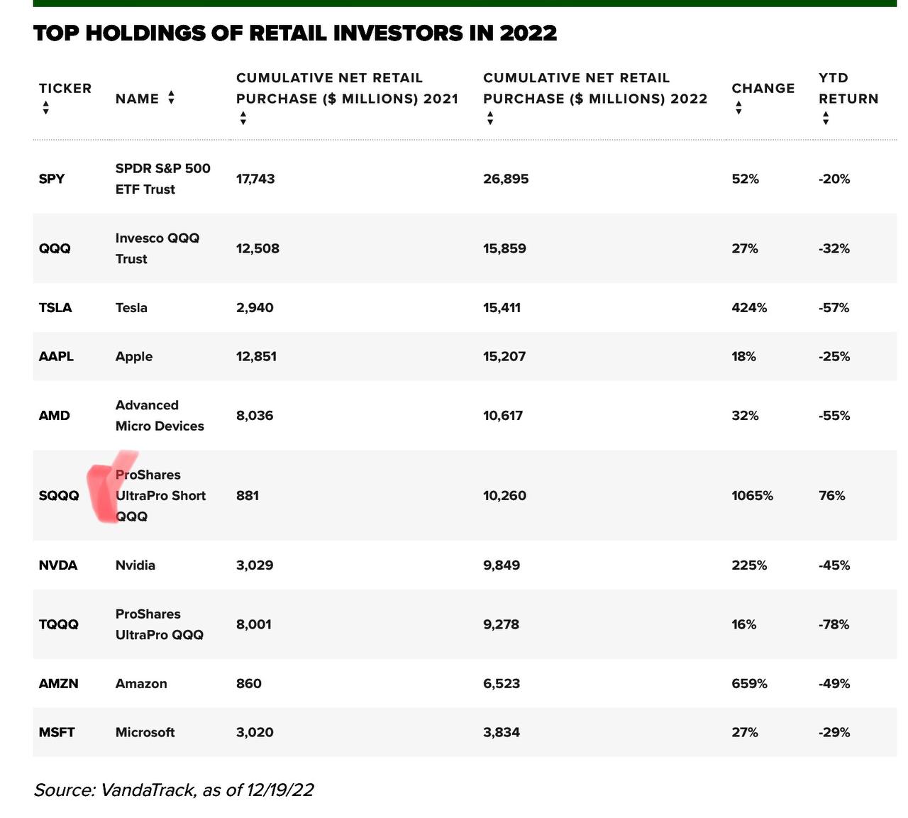 Все остальные активы, которые представлены в таблице, и которые пользовались наибольший популярностью среди инвесторов, завершили год не лучшим образом. Антигероем стал биржевой фонд, который тоже ставил на индекс Nasdaq, но на его рост и не просто на рост, а на рост с двойным плечом. Это фонд ProShares Ultra QQQ, который просел аж на 78%.