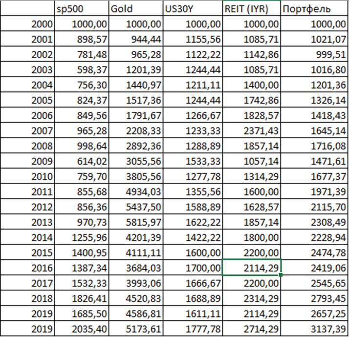 Для расчетов брались значения индекса SP 500, золота, 30-летних облигаций и недвижимости, представленной ETF на REIT. Период расчетов — с января 2000 года по сегодняшний день. К сожалению, более длинный промежуток времени рассмотреть не получилось, поскольку REIT как инструмент появился относительно недавно, и найти статистические данные по нему не представилось возможным.