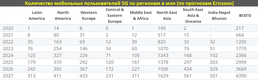 По данным Ericsson количество мобильных пользователей 5G в 2020 по всему миру было 217 млн, в 2021 – 664 млн, в 2022 может достичь 1.2 млрд и 4.4 млрд к 2027.