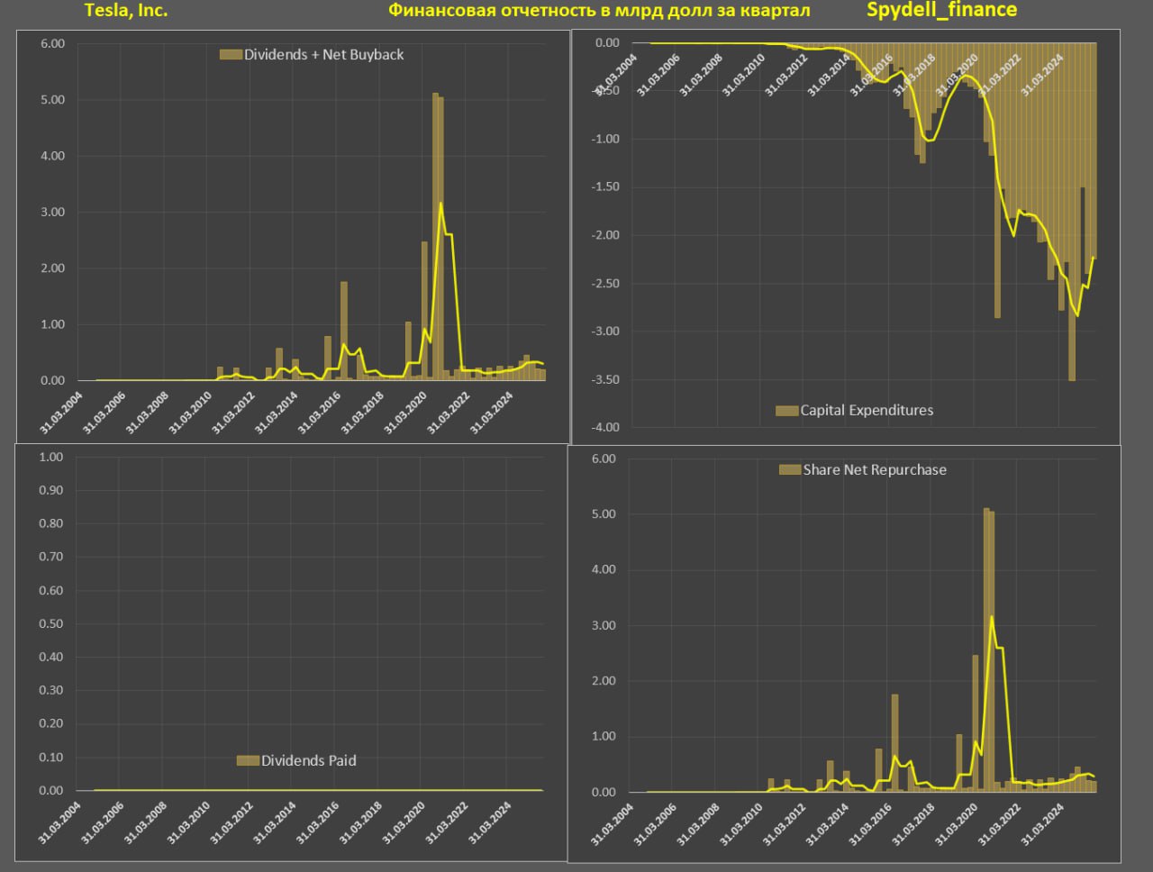 - Чистый байбэк и дивиденды: Tesla не платит дивы и не совершает байбэк, наоборот, размещая акции в рынок на 0.73 млрд за 9м25 vs 0.79 млрд за 9м24 и 0.55 млрд за 9м23.