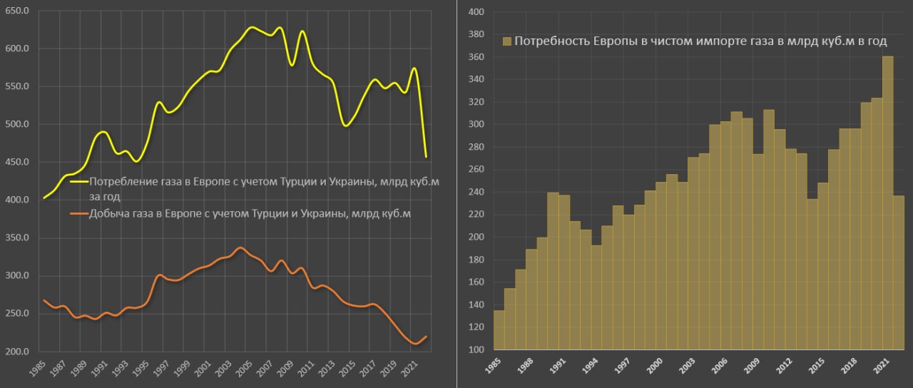 Европа с учетом Норвегии добывала 210 млрд кубов газа в 2021 и внутренняя добыча сокращается в темпах по 10-12 млрд куб.м в год. В 2022 негативная тенденция сокращения внутренней добычи может быть временно остановлена, потому что Европа использует все доступные и недоступные ресурсы и резервы, чтобы нарастить добычу. С января по май нарастили на 5%, но это не изменит общей диспозиции, потому что добыча будет на минимуме за 40 лет.